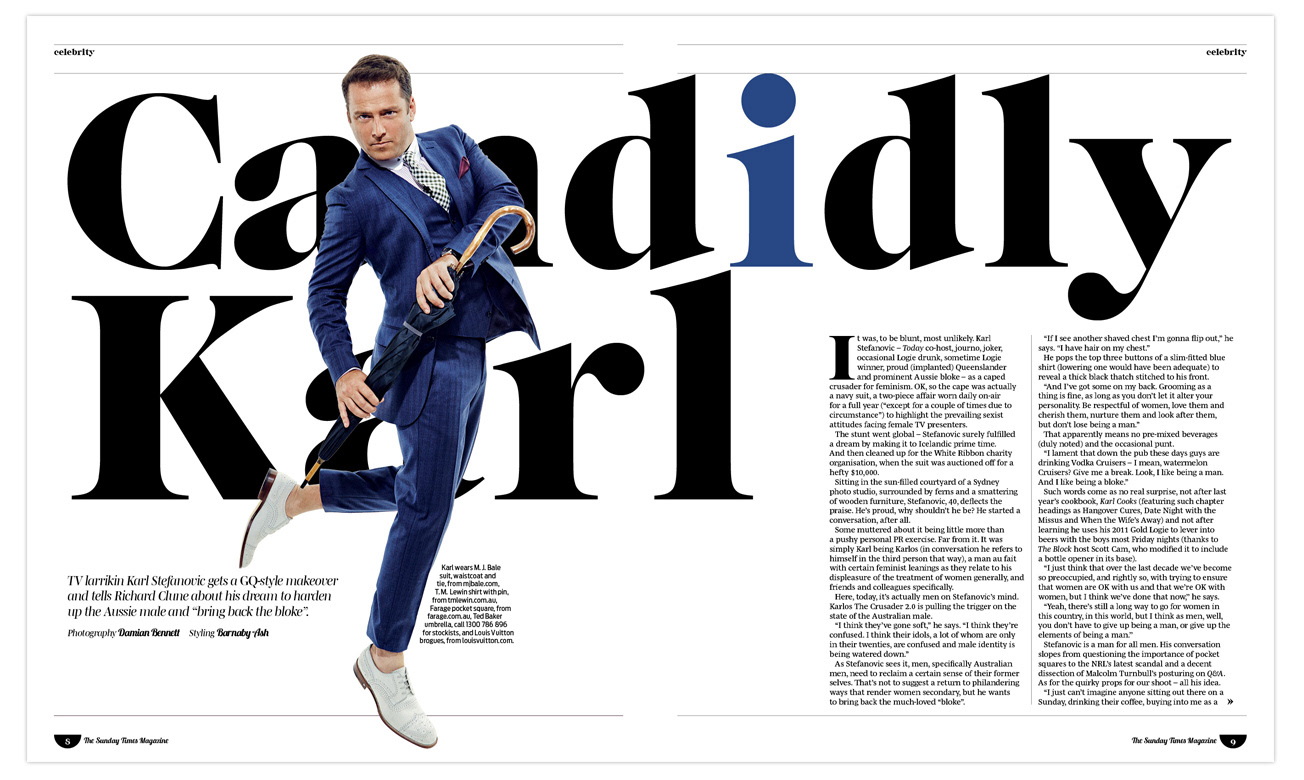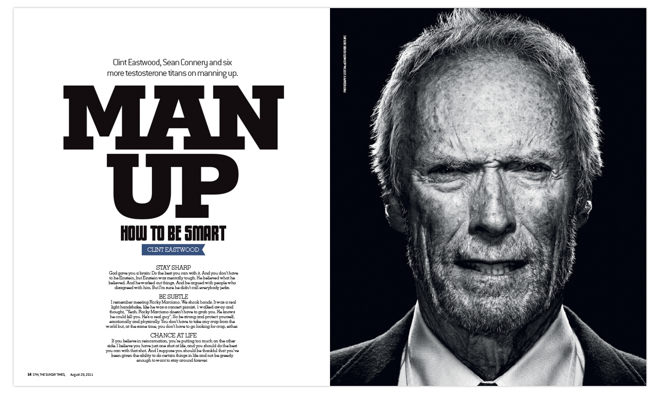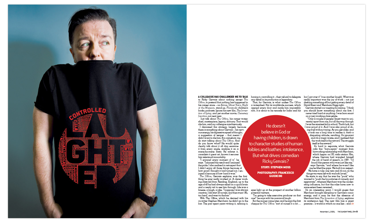A mixture of celebrity profiles for STM. Ricky Jervais I created a typographical artwork to enhance the controlled laughter concept.